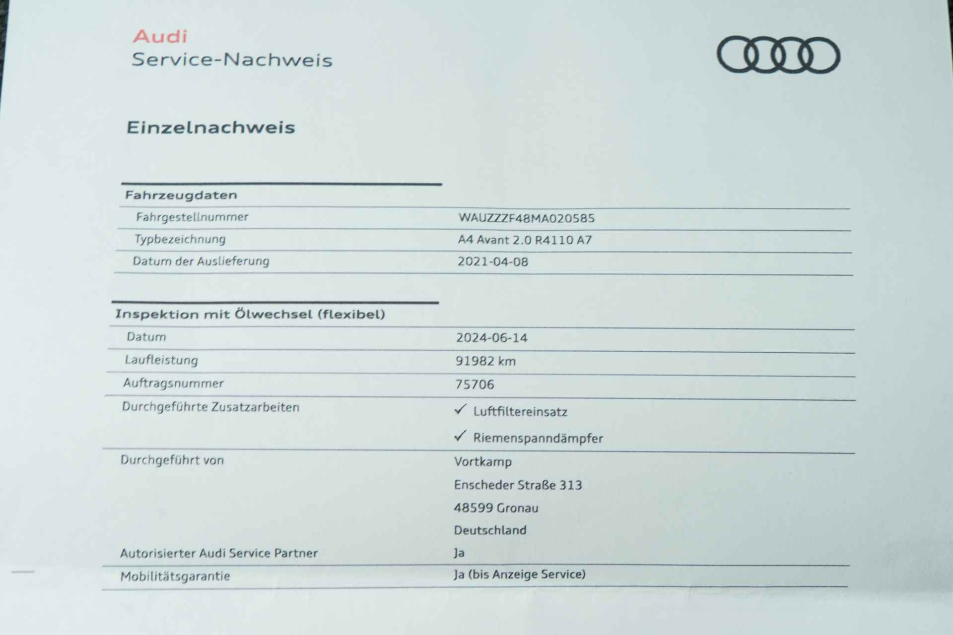 Deze keurige en goed onderhouden Audi A4 Avant is nieuw geleverd door Audi AG Gronau (Duitsland). De laatste servicebeurt is uitgevoerd bij kilometerstand 91.982. De historie uit Duitsland is ook aanwezig. Zie foto's.
