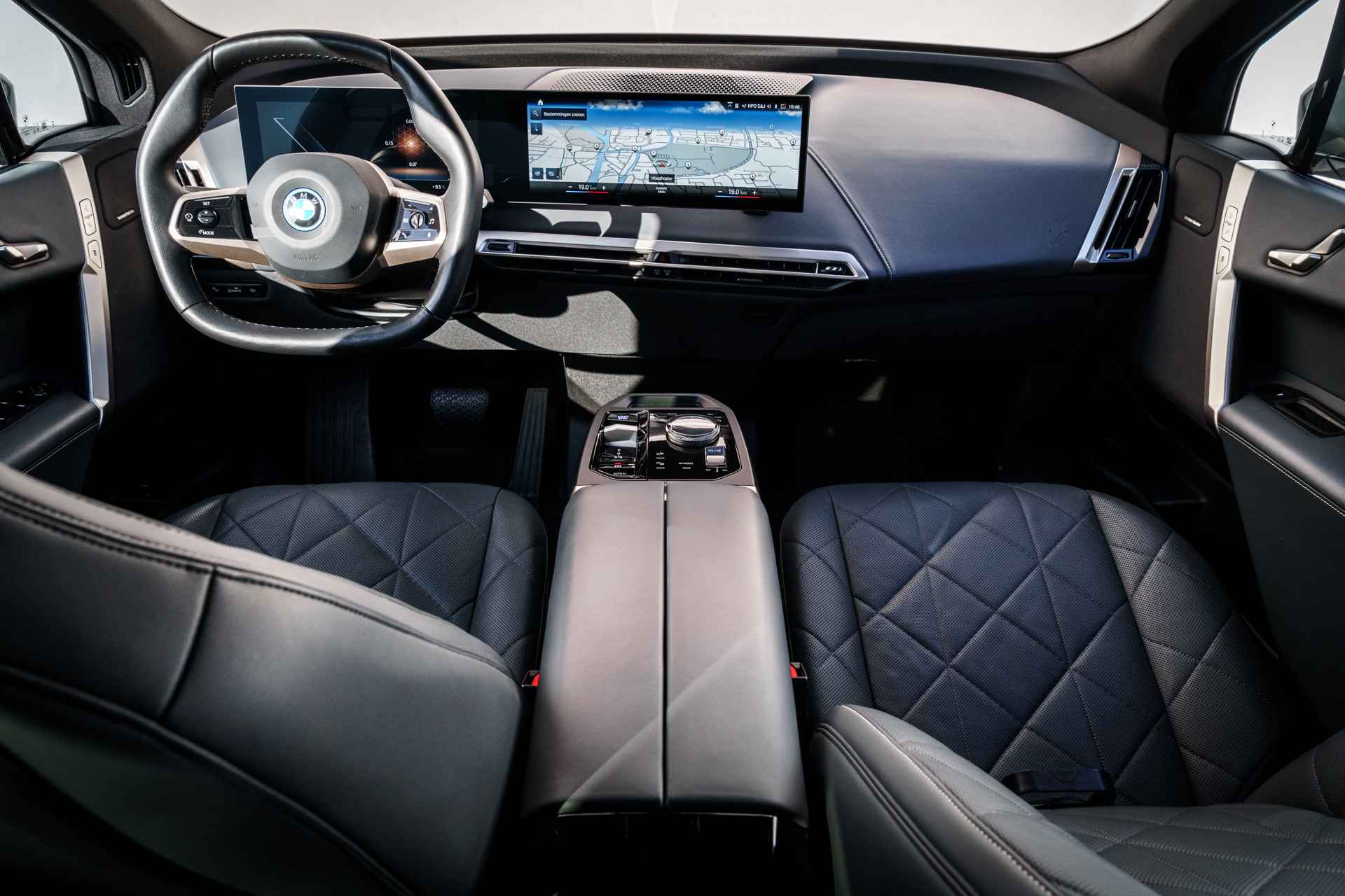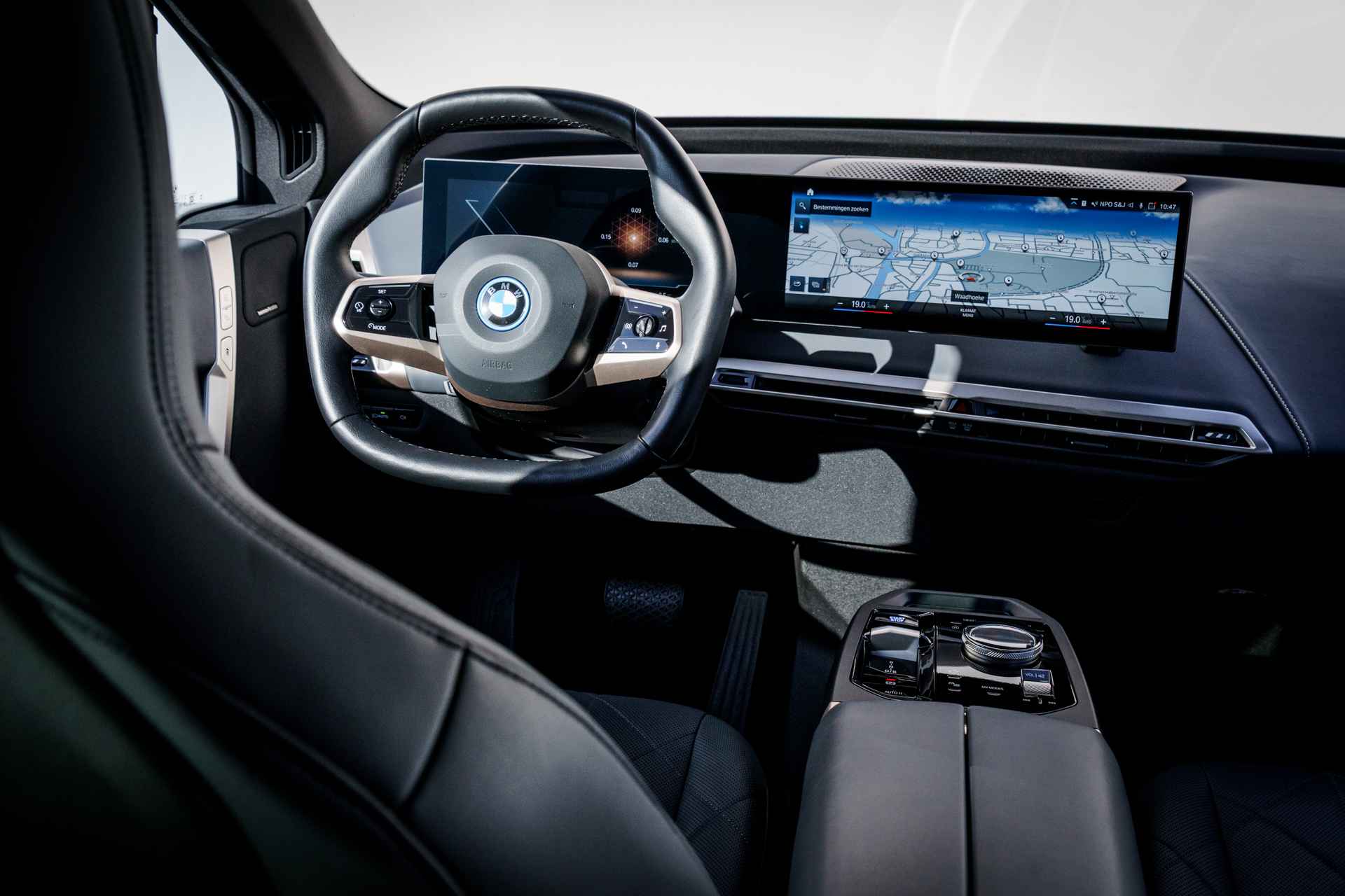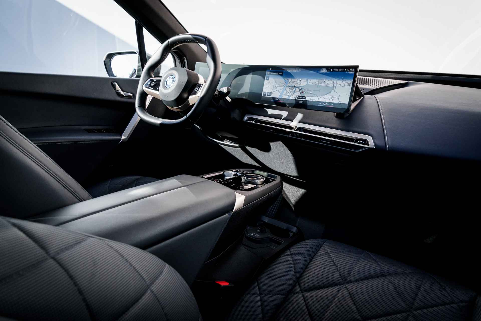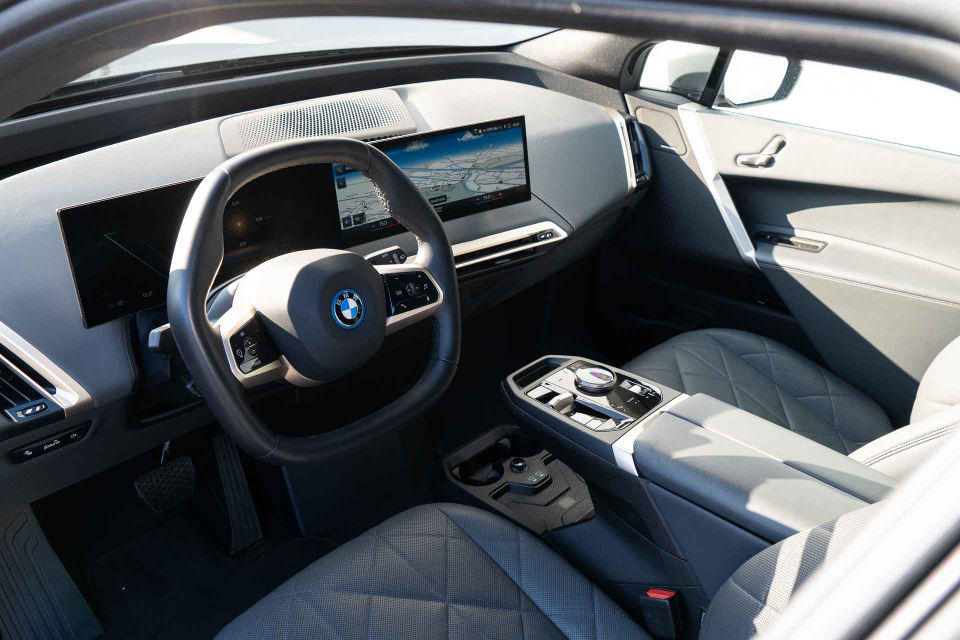 BMW had een reeks nieuwe elektrische auto's geïntroduceerd. De meest iconische daarvan is de "iX". Dat is niet alleen omdat de iX veruit de grootste is, maar ook omdat het model er bijzonder uitziet. De vormgeving van het interieur is minstens zo baanbrekend als die van het exterieur. Opnieuw zetten rechte lijnen en scherpe hoeken de toon. Een minimalistische opzet zorgt samen met bijzondere materialen (vegan leder) en kleuren voor een rustige sfeer. Alhoewel de iX niet de allerlangste SUV in zijn segment is, is de wielbasis wel uitzonderlijk lang en dat zorgt voor heel veel binnenruimte. Slechts één ding is klein aan de iX en dat is het dashboardkastje; dat is met het instructieboekje en enkele paperassen vol.