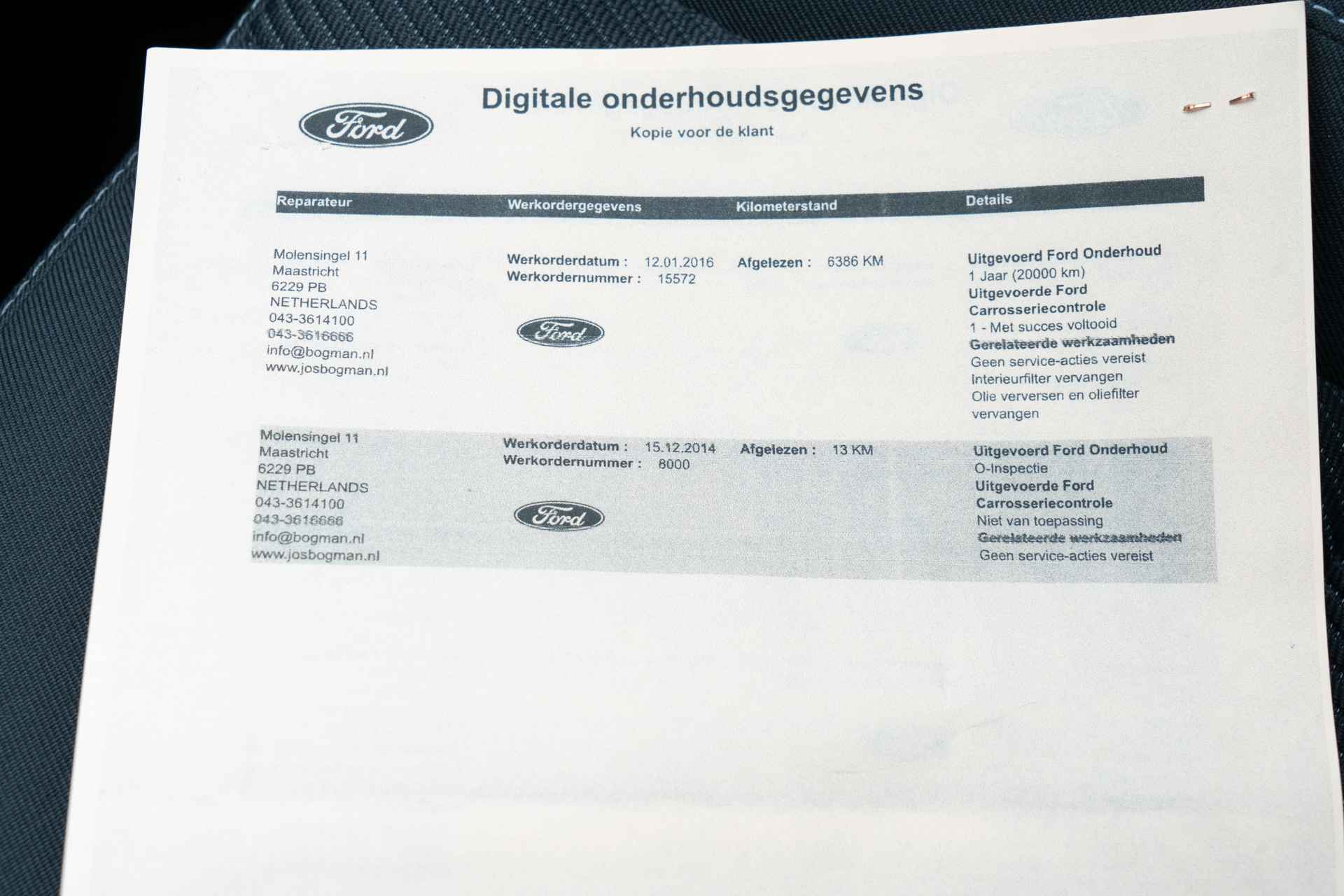 Deze Ford Kuga uit 2014 is afkomstig van de eerste eigenaar en origineel Nederlands geleverd. De auto is nieuw geleverd door Ford dealer Bogman in Maastricht, tegenwoordig Hekkert Maastricht, en is volledig dealeronderhouden. De laatste servicebeurt is uitgevoerd bij 44.253 kilometer door Ford Hekkert in Maastricht. De huidige kilometerstand bedraagt slechts 44.954 kilometer. Daarnaast is de distributieriem al vervangen bij 41.471 kilometer in 2024. Zie de uitgebreide onderhuidshistorie in de fotoreportage.